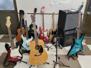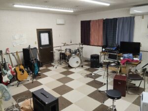 ギター、ベース、ドラム、アンプ、ピアノ、キーボード、パーカッション、音響機材、DTM機材、通信カラオケ(DAM)など、音楽に必要な環境はすべて整っています。